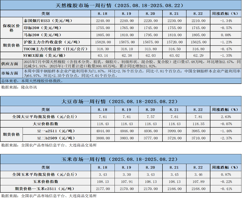 天然橡膠、大豆、玉米市場一周行情(2025.08.18-08.22)