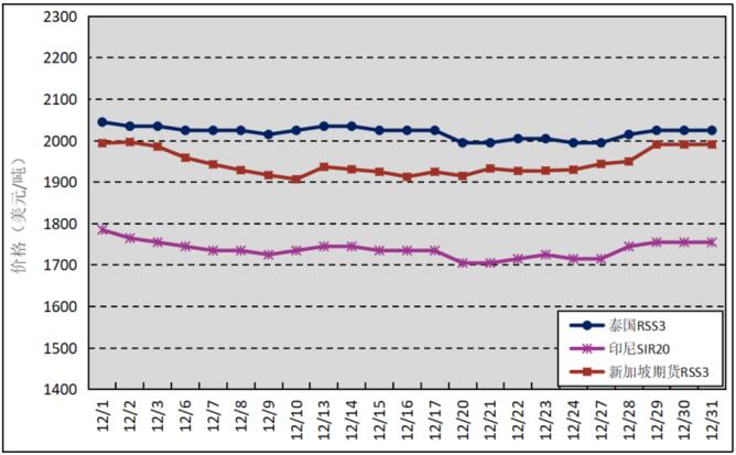 國外主產(chǎn)區(qū):12月,泰國RSS3平均價格為2020美元/噸,環(huán)比上漲54美元/噸,最高價為2045美元/噸,最低價為1995美元/噸;印尼SIR20平均價格為1738美元/噸,環(huán)比下跌7美元/噸,最高價為1785美元/噸,最低價為1705美元/噸;新加坡RSS3期貨主力合約月均結(jié)算價格為1946美元/噸,環(huán)比下跌4美元/噸,最高價為1997美元/噸,最低價為1907美元/噸。