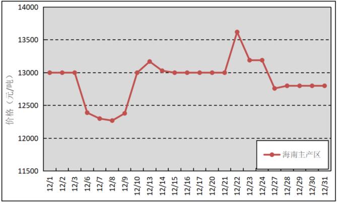 國內(nèi)主產(chǎn)區(qū):12月,云南產(chǎn)區(qū)基本停割,海南割膠也進入尾聲,原料供應(yīng)減少。原料膠(折干膠)月均價格為12891元/噸,環(huán)比下降27元/噸。