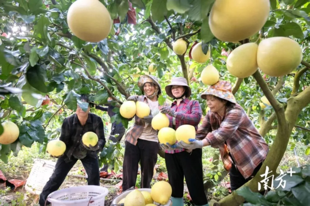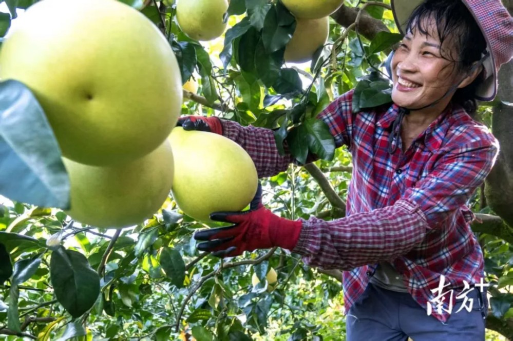 果農(nóng)臉上洋溢著燦爛的笑容,雙手輕柔地采摘著枝頭飽滿的柚子