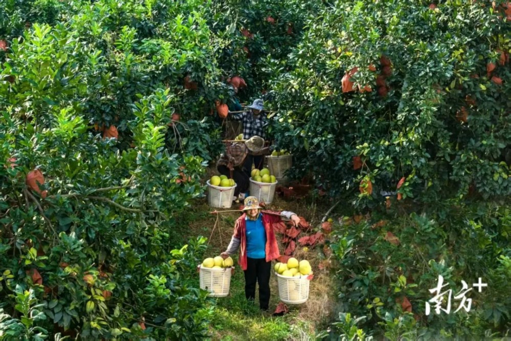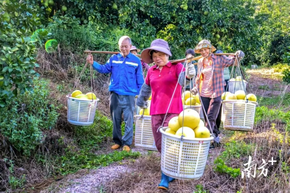 綠意盎然的柚子林中,柚農(nóng)挑著柚子穿梭其間,構(gòu)成了一幅生動的田園豐收圖