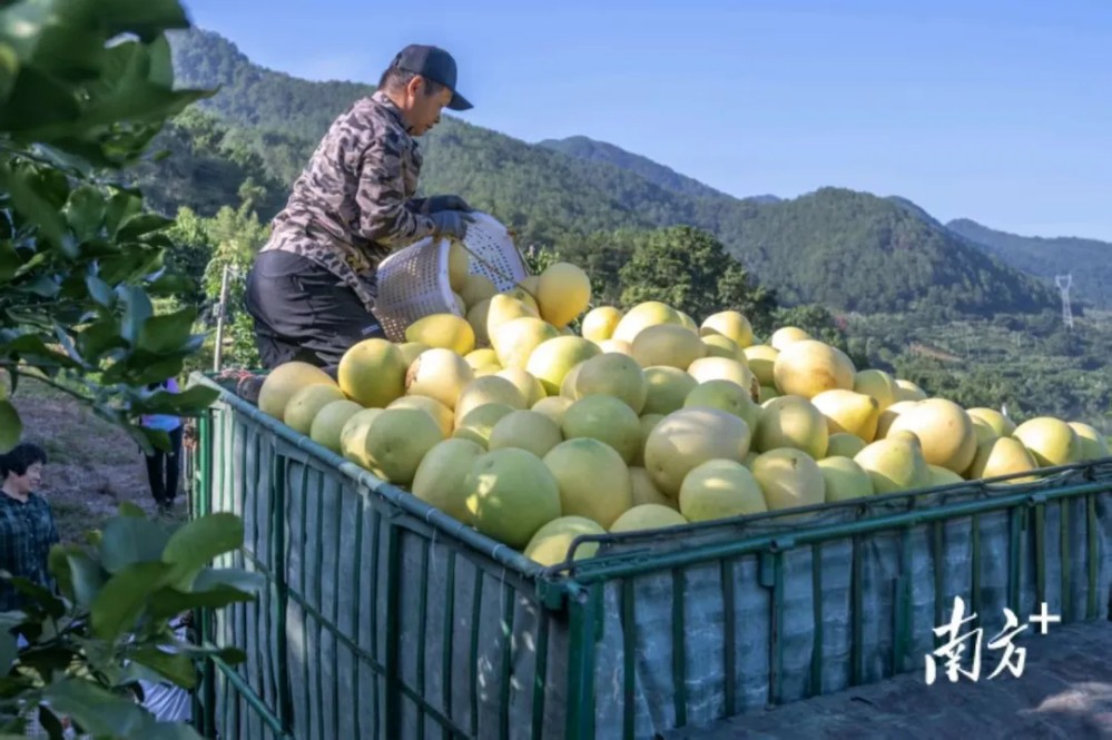 貨車停在果園旁,工人正將一筐筐金黃的柚子傾倒進(jìn)車廂,等待運輸