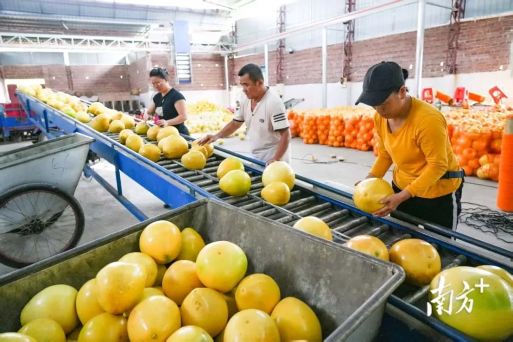 在現(xiàn)代化分揀線上,工人們正有序地將柚子放置在傳送帶上,進(jìn)行大小、品質(zhì)的篩選
