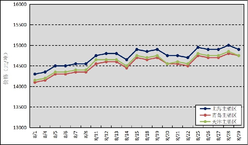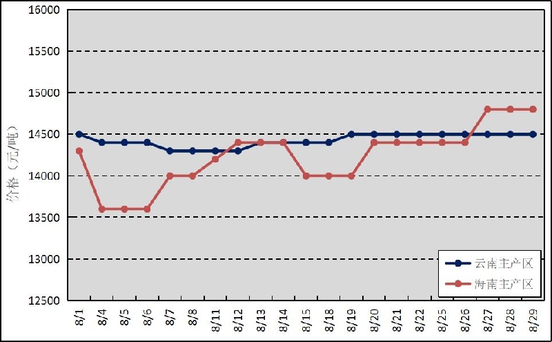 圖3 2025年8月國內(nèi)主銷區(qū)天然橡膠價(jià)格走勢