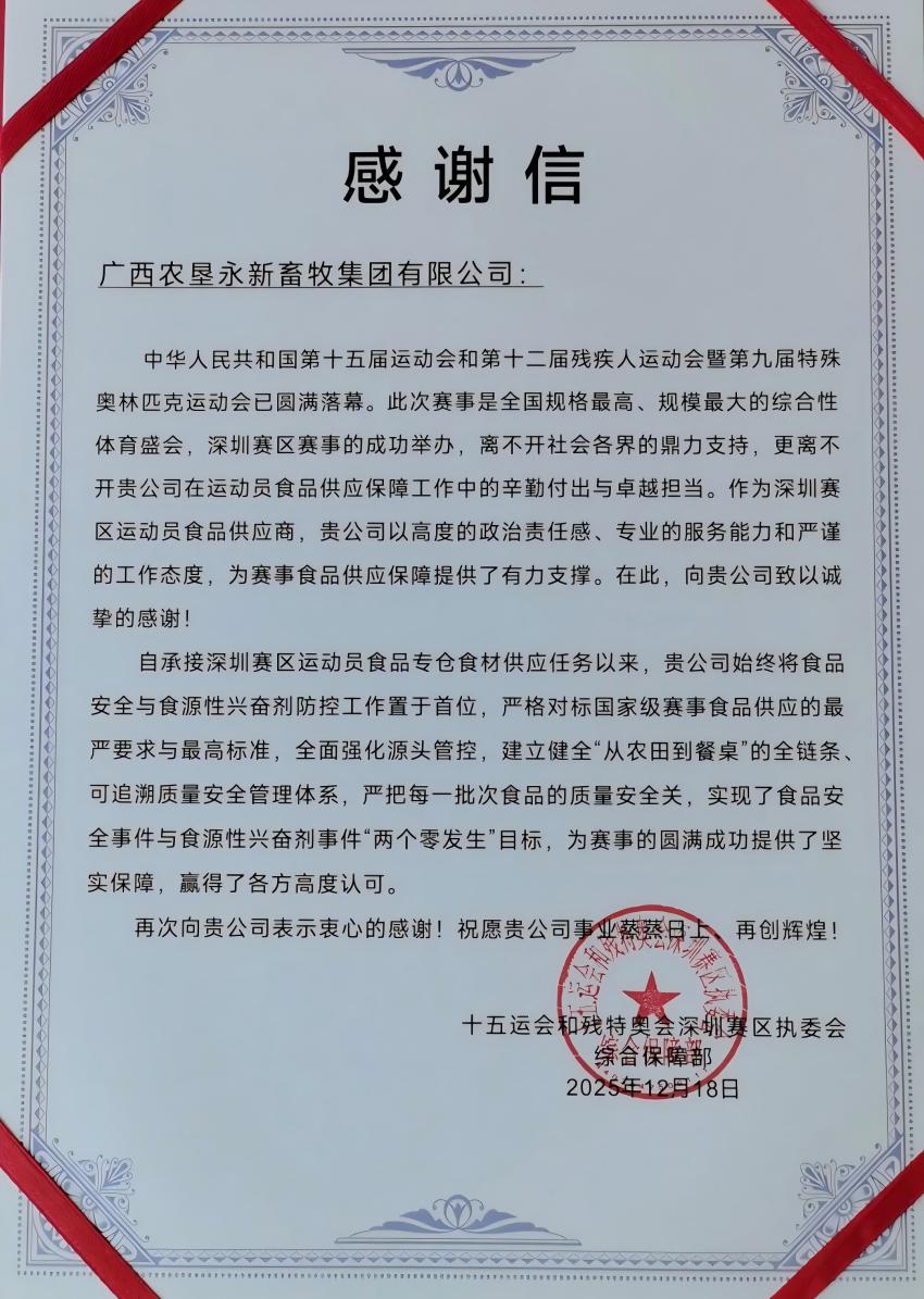 近日,永新畜牧集團(tuán)收到第十五屆全國運(yùn)動會和第十二屆殘疾人運(yùn)動會暨第九屆特殊奧林匹克運(yùn)動會深圳賽區(qū)執(zhí)委會發(fā)來的感謝信,對其在賽事期間的豬肉供應(yīng)保障工作給予高度評價與誠摯感謝。一封感謝信,不僅是國家級賽事對永新畜牧集團(tuán)的肯定,更是對其全產(chǎn)業(yè)鏈深耕的認(rèn)可。