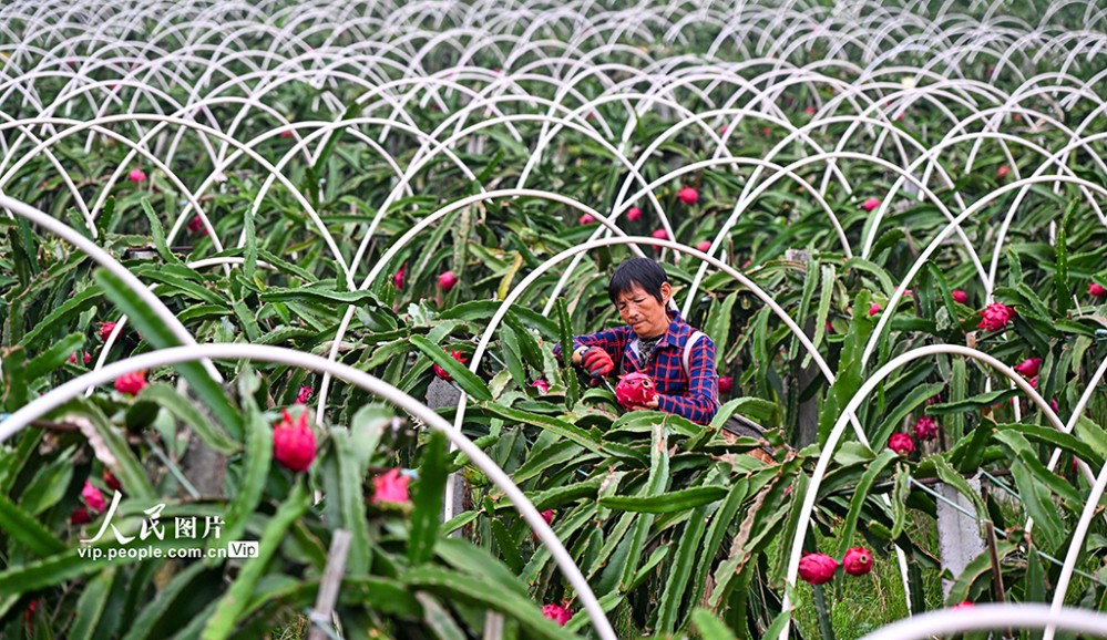 近年來(lái),當(dāng)?shù)匾虻刂埔艘?guī)模化發(fā)展火龍果、櫻桃等特色水果產(chǎn)業(yè),助力土地增效,村民增收。潘帥攝(人民圖片網(wǎng))