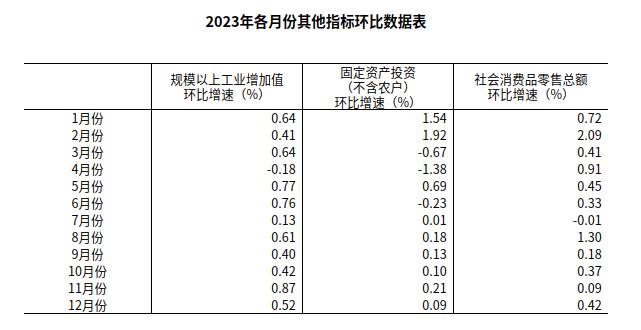 (2)根據(jù)季節(jié)調(diào)整模型自動(dòng)修正結(jié)果,對(duì)近一年來各期國內(nèi)生產(chǎn)總值、規(guī)模以上工業(yè)增加值、固定資產(chǎn)投資(不含農(nóng)戶)、社會(huì)消費(fèi)品零售總額環(huán)比增速進(jìn)行修訂。修訂結(jié)果及2023年四季度GDP環(huán)比數(shù)據(jù)、2023年12月份其他指標(biāo)環(huán)比數(shù)據(jù)如下: