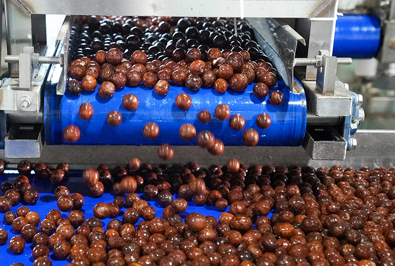 青果經(jīng)過脫皮、清洗、分色、剝殼、浮選、烘烤等工序后,變成棕色的殼果。刁弘智攝