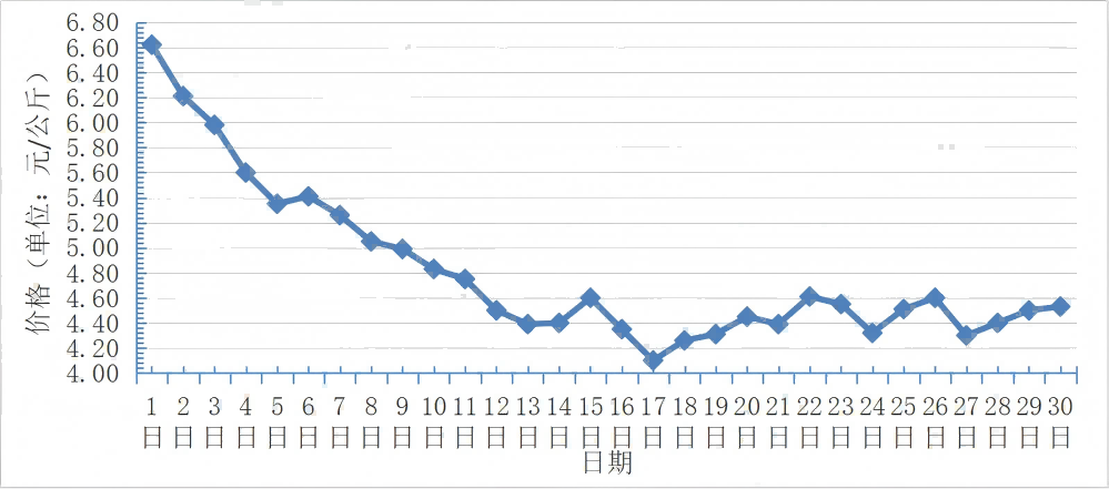 11月,全國(guó)重點(diǎn)監(jiān)測(cè)農(nóng)產(chǎn)品批發(fā)市場(chǎng)香蕉總交易量達(dá)2.2萬(wàn)噸,同比下降8.3%,環(huán)比下降4.3%;總交易價(jià)值10895.6萬(wàn)元,同比下降24.6%,環(huán)比下降12.1%。日平均價(jià)格最高為6.6元/千克,最低為4.3元/千克,全月平均價(jià)格為4.7元/千克,同比下降24.9%,環(huán)比下降2.1%(每日價(jià)格變化如圖)。