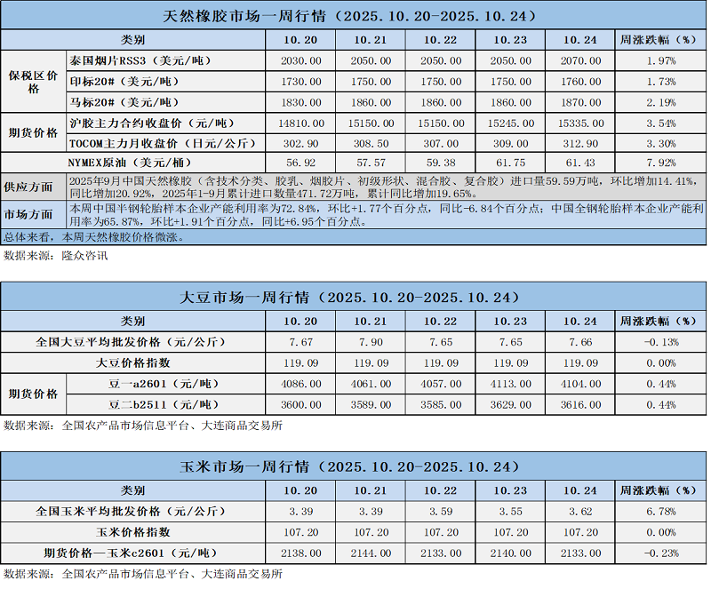 天然橡膠、大豆、玉米市場(chǎng)一周行情(2025.10.20-10.24)