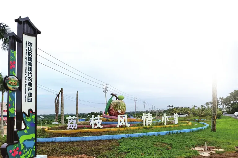 從海口出發(fā),沿223國(guó)道一路南行,在一片一眼望不到邊的荔枝園旁,一顆碩大的“荔枝”闖入眼簾,旁邊“荔枝風(fēng)情小鎮(zhèn)”幾個(gè)大字,讓人馬上意識(shí)到已抵達(dá)三門坡鎮(zhèn)。