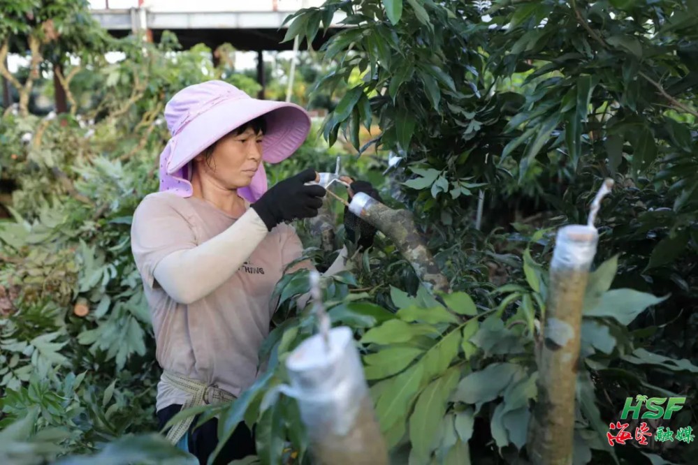 夕陽西下,荔枝園沐浴在金色的余暉中,工人仍在園中忙碌著,一株株新嫁接的荔枝樹在微風(fēng)中輕輕搖曳,孕育新的希望。