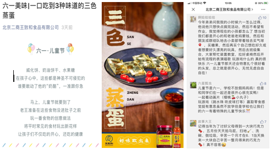 二商股份王致和為慶?!傲弧眱和?jié)到來,在微信公眾號(hào)即時(shí)推出“一口吃到三種味道的三色蒸蛋”定制食譜,并以“你最難忘的‘六一’是什么樣的呢?”為話題,開展留言區(qū)抽獎(jiǎng)活動(dòng),得到眾多粉絲的關(guān)注和參與。