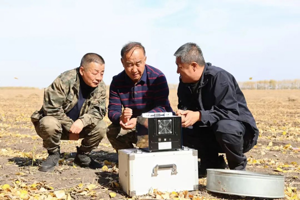 長(zhǎng)水河農(nóng)場(chǎng)技術(shù)人員測(cè)量墾地托管地塊大豆水分和蛋白含量。劉曉巖 攝