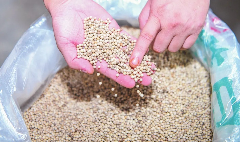 在大坡鎮(zhèn),海南楊元廣胡椒貿(mào)易有限公司工作人員向記者展示經(jīng)過(guò)仔細(xì)篩選后的胡椒顆粒。